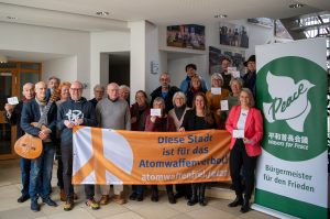 Anlässlich des heutigen Jubiläums zum Inkrafttreten des Atomwaffenverbotsvertrags übergaben Gemeinderat William Dreher und der Radsportler Reiner Fuchs (Hoffenheim) heute das Trikot des letztjährigen Nuclearban Marathons an Bürgermeister Hagen Zuber. Damit wird zukünftig im ersten Rathaus Deutschlands ein solches Trikot zu sehen sein. „Mit dieser Aktion würdigen wir den Vertrag und setzen als Unterstützung des ganz besonderen Radevents ein deutliches Zeichen für Frieden“, betont Bürgermeister Zuber. Über 120 Radsportlerinnen und Radsportler engagierten sich Anfang August 2025… weiterlesen